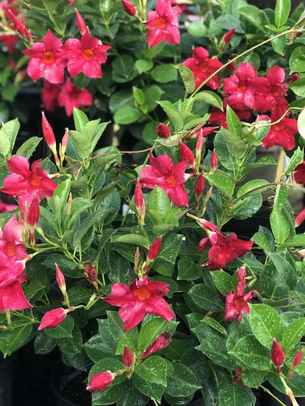 Bold and showy, Mandevilla definitely makes a dramatic statement in landscapes and container gardens. This tropical vine bears a nonstop supply of large, trumpet-shaped blooms in shades of red, pink, and white.