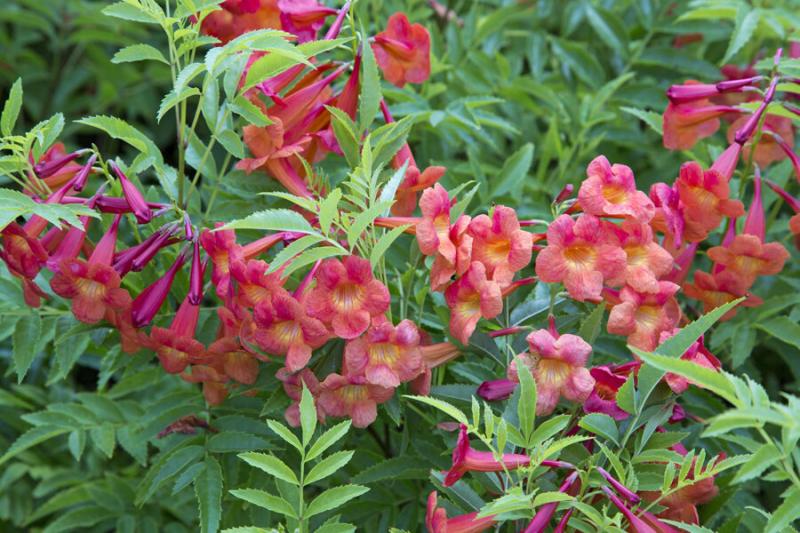 Evergreen mid-sized shrub with a subtropical to tropical appearance and bell-shaped flowers. This new variety is more compact and has more color range.