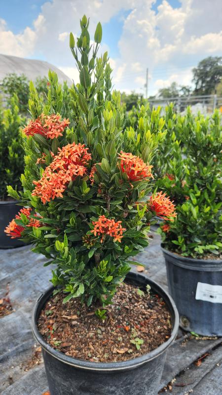 One of the best things about ixora is that it flowers throughout the year! Each flower cluster can last between 6 and 8 weeks giving your landscape long-lasting and lovely color. The leaves of this tropical perennial are bronze when young and shift to glistening dark green as the plant ages. A compact, densely-branching shrub, ixora is ideal for planting as a hedge, border, screen, or featured specimen.