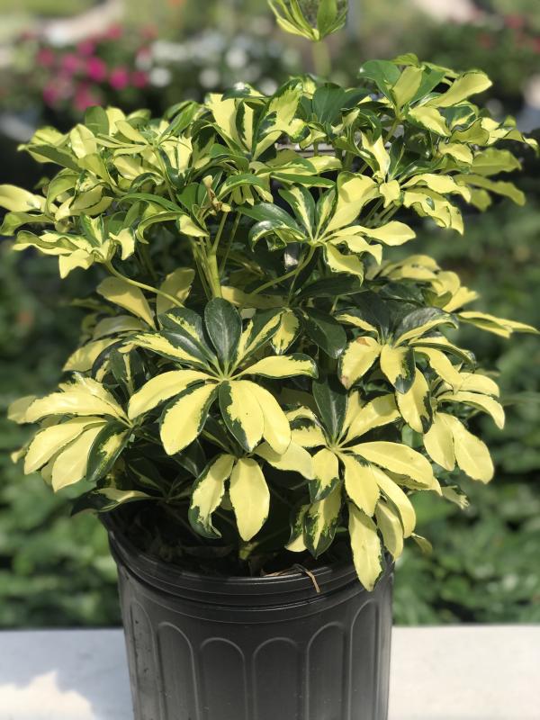 'Trinette' is a variegated variety of umbrella plant with large patches of creamy yellow lighting up its foliage. Perfect for brightening a room solo or enlivening a mix of green-leaved plants. Schefflera may initially drop leaves as they adjust to a new setting, but really are vigorous and easy care plants. They may be pruned to control height or shape.