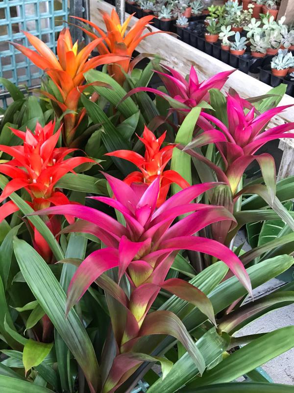 Guzmanias are well known for their long lasting flower which can hold up to three months in good light. Plants can easily be propagated from the offsets which appear as the flower fades. They are epiphytes and can do well if tied on to pieces of bark with roots bound into sphagnum moss. Guzmanias require warm temperatures and relatively high humidity.