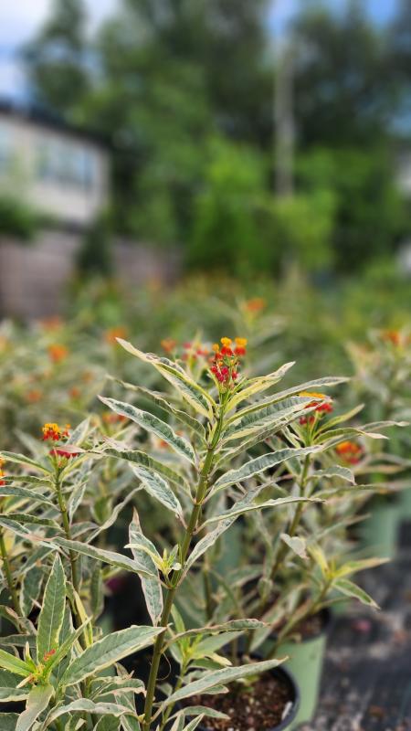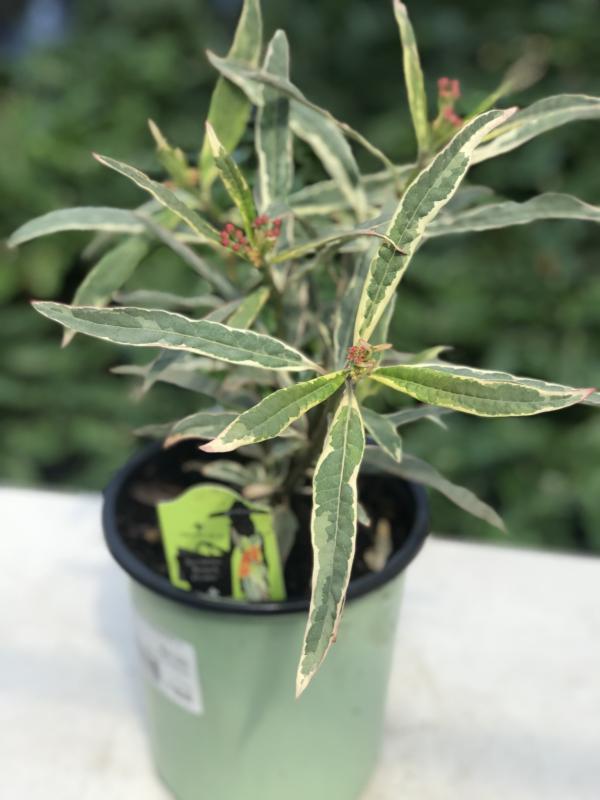 This very special 'Asclepias curassavica'' has beautiful green and white variegated foliage that is tinged with red, orange and pink leaf tips. The bright orange-red flower attracts Monarch butterflies and many other species of butterflies, bees and hummingbirds.