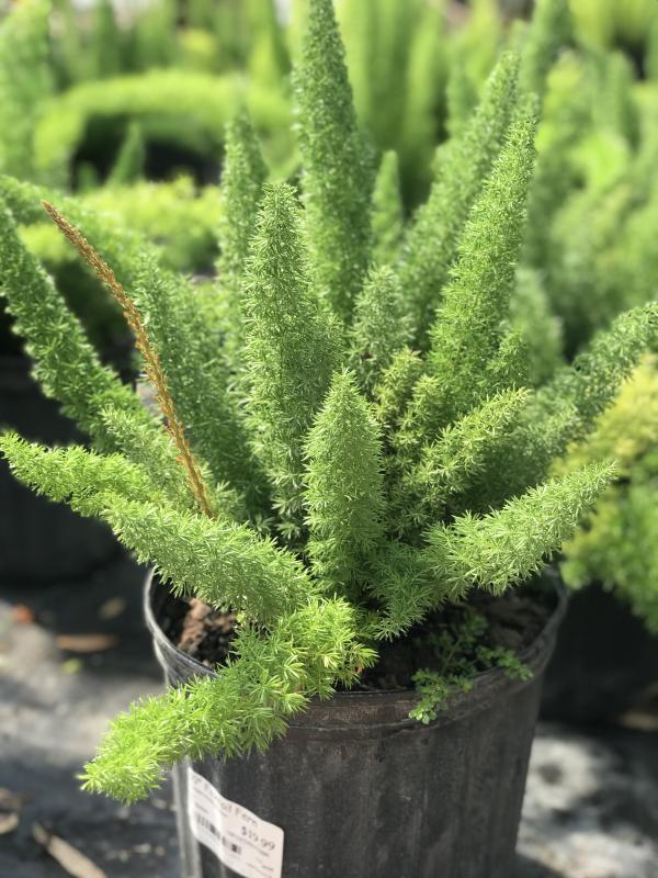This fern grows to about 3 ft. tall and wide. It’s unique growth habit looks similar to fox tails. It does best in full sun to part shade.