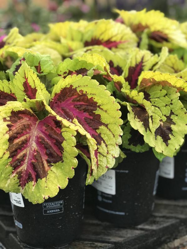Coleus Kong Rose is all about its huge foliage! Unique color combinations on foliage add interest to shade or part sun landscape beds and containers. Can tolerate full sun if kept moist.