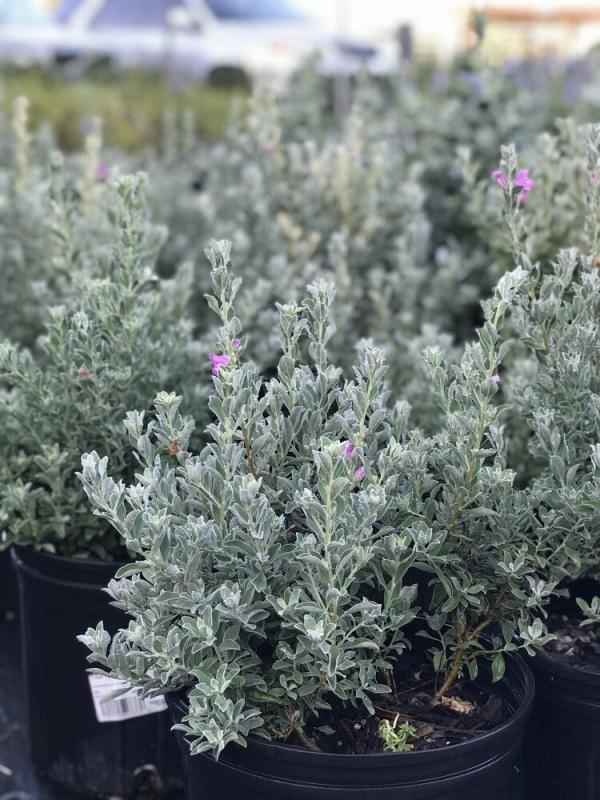 A flowering shrub that blooms intermittently throughout the year. Blooms are a delicate lavender that compliment the silvery gray foliage.