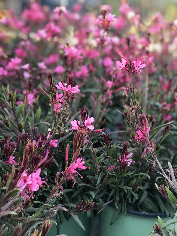 Gaura, also known as Whirling Butterflies, has an abundance of delicate pink or white flowers which hover on long stems above the foliage like little butterflies, hence the common name. The foliage is typically green, although many cultivars are available, some with reddish foliage and some more compact than others. Blooming most of the year, this is a great low maintenance perennial for cottage gardens, butterfly gardens, mass planting or as part of a mixed border.